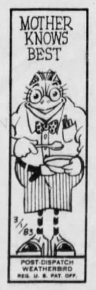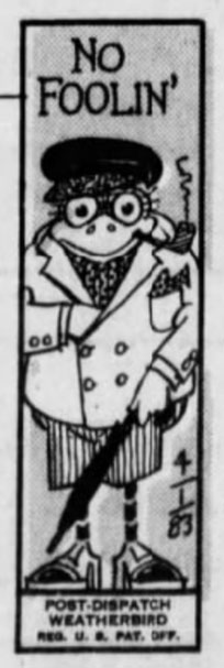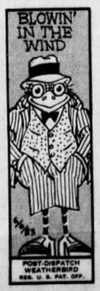 In 1981, Al Schweitzer succeeded Amadee Wohlschlaeger as the cartoonist of the daily 'Weatherbird'. These small cartoons appeared on the paper's front page to lighten up the daily weather report. One of the longest features in the St. Louis Post-Dispatch, the Weatherbirds had been drawn subsequently by Harry B. Martin (1901-1903), Oscar Chopin (1903-1910), S. Carlisle Martin (1910-1932) and Amadee Wohlschlaeger (1932-1981), while the texts were written on a competitive basis in the paper's newsroom. Despite its long run, Schweitzer was only the fifth in row to draw the Weatherbird. Apparently, the cartoonist was the perfect fit for the birds, as the Post-Dispatch wrote in 2001: "He of the bow tie, straw boater, spiffy blazer and umbrella hooked over an arm. At times it seemed like he was a walking duplicate, at least in his attire, of many of the Weatherbirds of the 1920s." Schweitzer's Weatherbirds were notable for being overall happy cigar chompers. They were also the first to be drawn consistently in color. Al Schweitzer drew the feature until his retirement in December 1986, when Dan Martin took over.