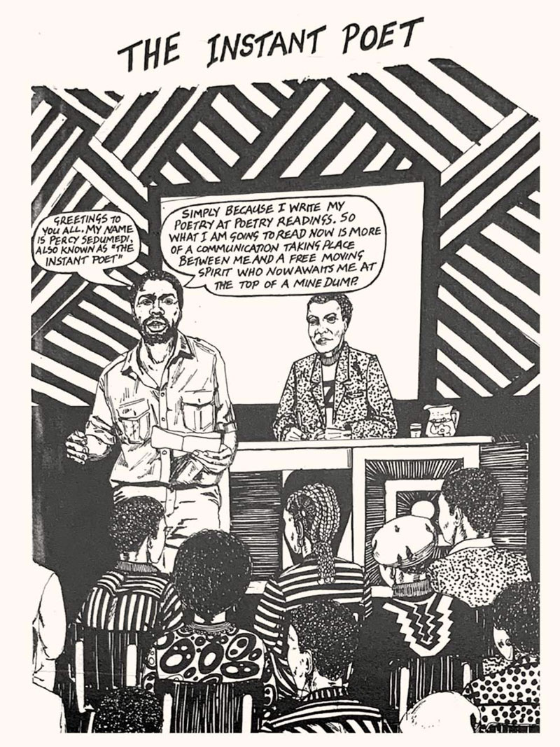 Based in Durban, Sedumedi's comics ran in magazines like Staffrider and Drum during the 1980s. The latter publication featured his comic 'Mzi Mzo'. In 1981, Robert Berold published 'The People's Workbook', a manual on how to conduct several practical matters, like farming, starting a library, dealing with police and making a will. The "how to do it" illustrations were provided by Percy Sedumedi.