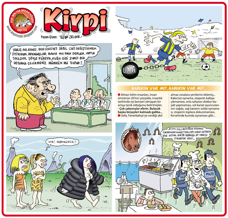 Selçuk also drew for comic magazines published outside of İzmir, such as Mustafa and Sinek. He then worked as a graphic designer for some agencies and the packaging industry. Selçuk participates in caricature contests and exhibitions and is a member of the Caricaturists Association. Tufan Selçuk has been working as a caricaturist and graphic designer for the newspaper Yeni Asir since 2000.
