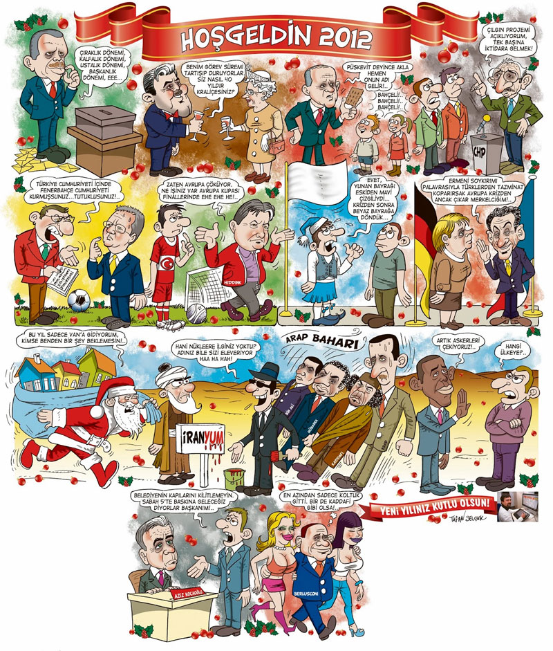 Political caricatures by Tufan Selçuk, 2012. We recognize, among others, Turkish president Tayyip Erdogan (first panel), German chancellor Angela Merkel and French President Nicolas Sarkozy (eighth panel), Libyan president Mummar Qadaffi, Syrian president Bashar-al Assad and U.S. president Barack Obama (ninth panel) and Italian Prime Minister Silvio Berlusconi (tenth panel).