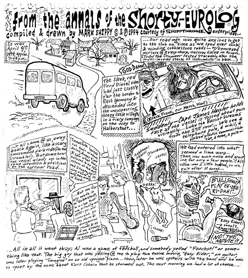 Around this same period, Shippy was also working as an indie cartoonist in the Chicago area. Designing pamphlets and comics, much of his output was dedicated to his band, especially after Shorty was picked up by the SKiN GRAFT Records label. Founded by Chicago art school students Mark Fischer and Rob Syers, SKiN GRAFT was notable for adding self-published and punk-inspired comix to the inner sleeves of their LP, EP and single releases. For Shorty's 1993 single 'Kaput!', Mark Shippy did most of the graphic design, as well as several pages for the comic book insert. Other contributors to this release were SKiN GRAFT cartoonists Mark Fischer, Rob Syers and Dan Grzeca. Together with the cartoonist Kurt Diesel, Shippy provided the artwork for the 1994 Shorty EP 'Fresh Breath'. In 1994, Mark Shippy created the one-page comic 'Shorty's Euro-Log' for the SKiN GRAFT newsletter, covering the group's European tour.