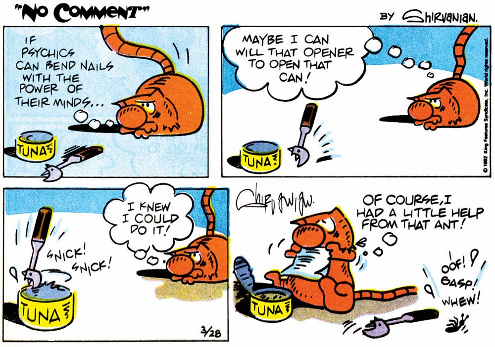 In 1980, Shirvanian scrapped all of his previous characters in favor of a lazy and womanizing orange cat called 'Brimstone'. Now having a permanent main character, 'No Comment' was easier to pigeonhole by readers, while the comedy became more straightforward. However, already being the third orange cat protagonist in a newspaper comic after George Gately's 'Heathcliff' and Jim Davis' 'Garfield', didn't do Brimstone any favors in originality. After two years, Brimstone was finally adopted by a young woman and the series concluded.