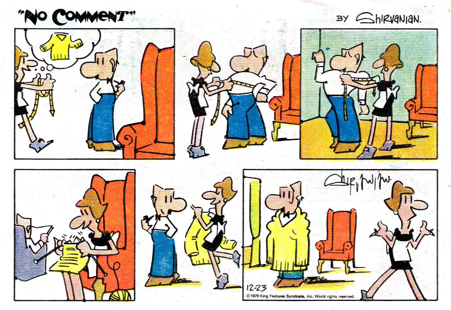 Between 9 April 1979 and 25 April 1982, King Features Syndicate distributed Shirvanian's daily and Sunday comic strip 'No Comment' to hundreds of newspapers throughout the nation. The strip had a revolving cast of characters, and initially featured absurd pantomime gags with a quarreling husband and wife. Gradually more colorful personalities turned up, including a fakir, a magician with a rabbit, a huge dog and an everyday guy with a checkered cap. Out of all these odd individuals, an elephant eventually became the series' new protagonist. Shirvanian soon dropped the pantomime comedy in favor of dialogue.