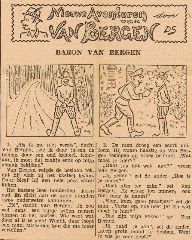 Starting on 6 February 1946, the Nieuwe Provinciale Groninger Courant ran several stories with the adventures of mister 'Van Bergen', published with one or two panels a day and with text captions in rhyme. In the debut episode, the title character leaves his wife to go out hunting. It wasn't until 26 February 1947 before he returned home, having experienced all sorts of weird and funny adventures. Some feature everyday situations, like Van Bergen having a toothache, going out fishing and losing his hat. Other stories are more adventurous, when Van Bergen gets in trouble with a group of robbers, or when he tries to build an airplane. Since the narrative appeared in a devout Christian newspaper, the stories were family-friendly, although Sikkema didn't shy away from having his hero almost be hanged by the robbers, who in turn were killed during a shootout. In 1946 and 1947, the newspaper's Groningen publisher Jan Haan released six booklets with Van Bergen's adventures.