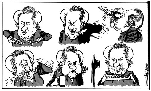 'Camp David', cartoon by Dave Simpson, depicting Israeli Prime Minister Ehud Barak, PLO leader Yasser Arafat and U.S. President Bill Clinton.