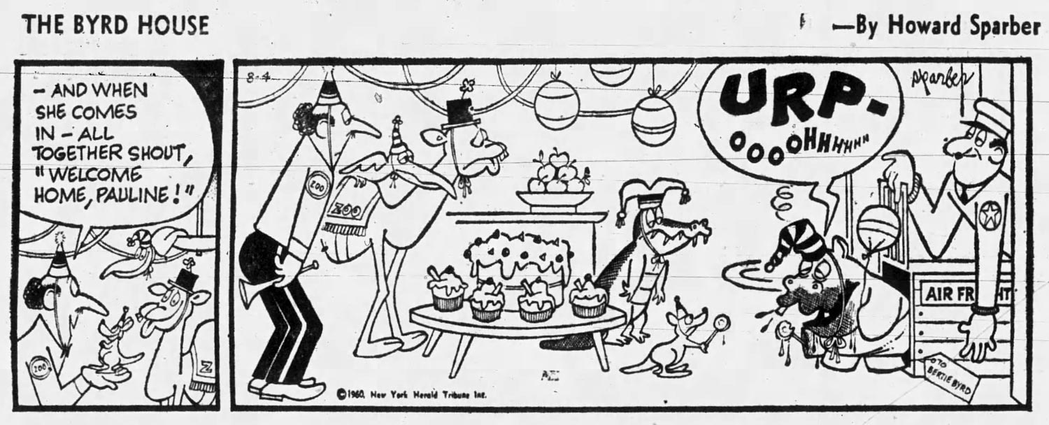 Sparber then created 'The Byrd House', a comic strip about a group of zoo animals, distributed through the New York Herald-Tribune Syndicate between 23 May 1960 and 4 March 1961. It was replaced by David Gantz's 'Dudley D.' Between 1960 and 1962, Sparber assisted Crockett Johnson on the children's comic 'Barnaby'. Howard and Jean Sparber additionally created 'Trix of the Trade', a series of household hints in cartoon form. The cartoon series was distributed by the Chicago Tribune-New York News Syndicate between 6 September 1965 and 1967.