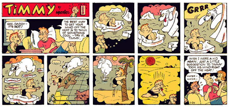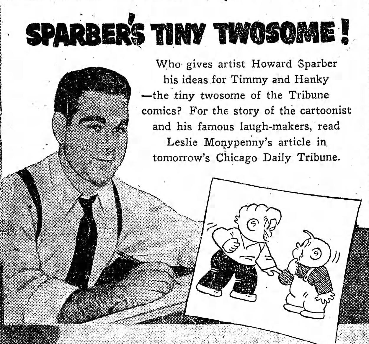 Sparber's best-known character is the kid 'Timmy', who starred in light-hearted cartoon panels and comic strips alongside his parents and brother Hanky. 'Timmy' first appeared in single panel cartoons in Collier's magazine in 1947. The early cartoons were written by Raymond Abrashkin. By 8 December 1947 the feature was picked up by the Chicago Tribune-New York News Syndicate, after which it appeared on a daily basis in newspapers. A Sunday color feature was added on 31 October 1948, which came with the companion strips 'Hanky's Dream World' (1948-1949, starring Timmy's kid brother) and 'Crax and Jax' (1949-1959, starring two puppet show characters). The daily panel became a comic strip in early 1949, but changed back to a panel in 1954. 'Timmy' ran in syndication until 1959. Between 1956 and August 1959, the character also inspired four similarly titled comic books in Dell's Four Color Comics series. The books featured short stories which were not created by Sparber, however, but by Dell/Western staffers instead.