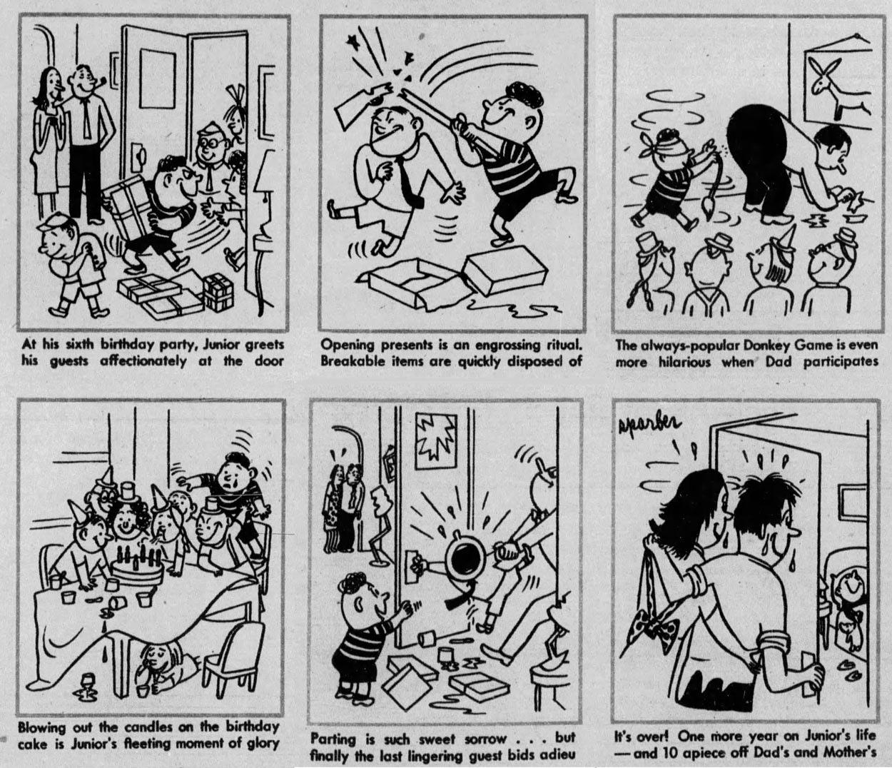 Cartoon series by Sparber and Abrashkin about a kid's birthday party, published in the Los Angeles Times on 29 June 1947.