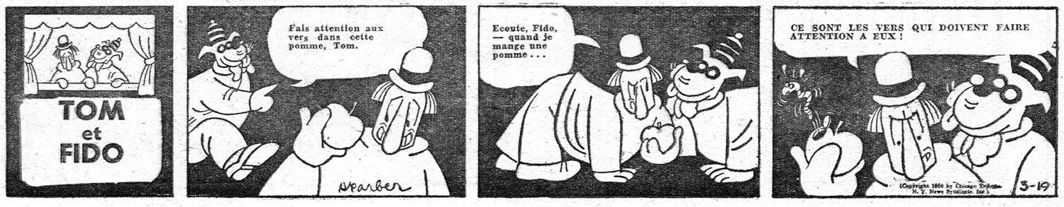 'Tom et Fido' (French-Canadian edition of 'Crax and Jax'). Translation: "Pay attention for wurms in that apple, Tom." - "Listen, Fido, when I eat an apple, it's the wurms who ought to pay attention to themselves!".