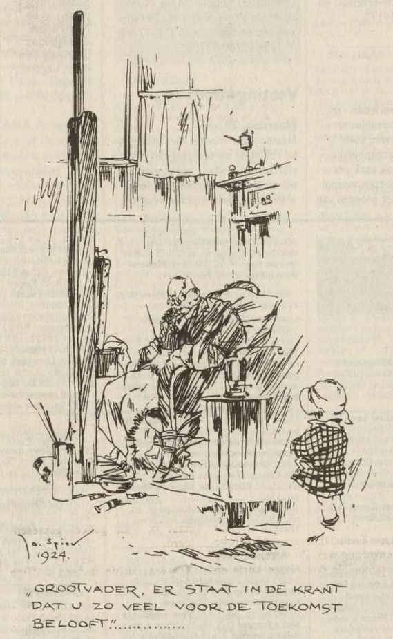 "Grandpa, the paper says you have so many promises for the future..." (1924 cartoon from De Telegraaf, foretelling Spier's later influence on Peter van Straaten).