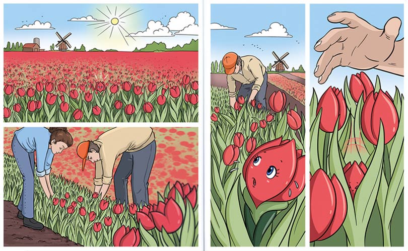 At Tekenteam, Van der Stadt worked as illustrator and project coordinator. Besides Okki, she has created artwork for amusement parks, children's books and organizations, finetuning her skills in several techniques and styles. Since 2017, Van der Stadt has worked solo as Studio Sabine, doing cartoons, illustrations, infographics and character designs. Her artworks have appeared in/on children's picture books, birth cards, coloring pictures and Jumbo game packaging, among other things. In 2017, Van der Stadt illustrated the wordless picture story 'Tilly Tulp' by Lotte Alders, telling the story of a little tulip who goes on an adventure. Among her other children's book illustrations are 'Bibi & Lulu - Het is Feest!' (Moon, 2020), written by media personality Patty Brard, and the book series 'Rutger, Thomas & Paco' (Kosmos, 2021- ) by the YouTube stars Thomas van Grinsven and Ruger Vink. The latter books also contain comic story segments, for which Erik Havertkort and Bas Schuddeboom are among the writers.