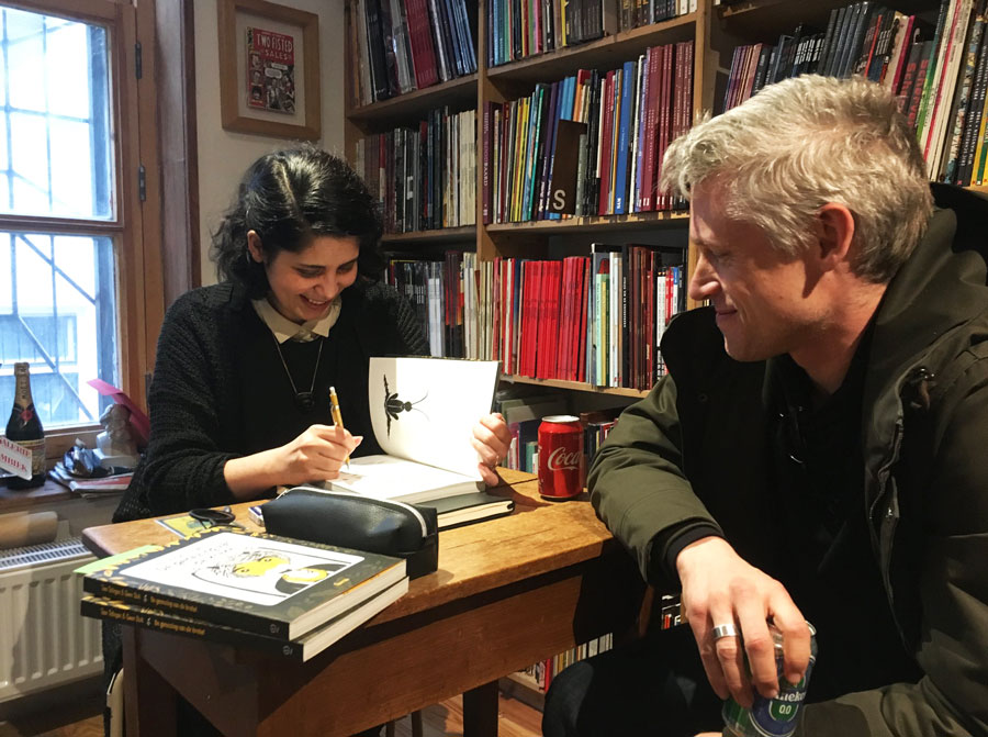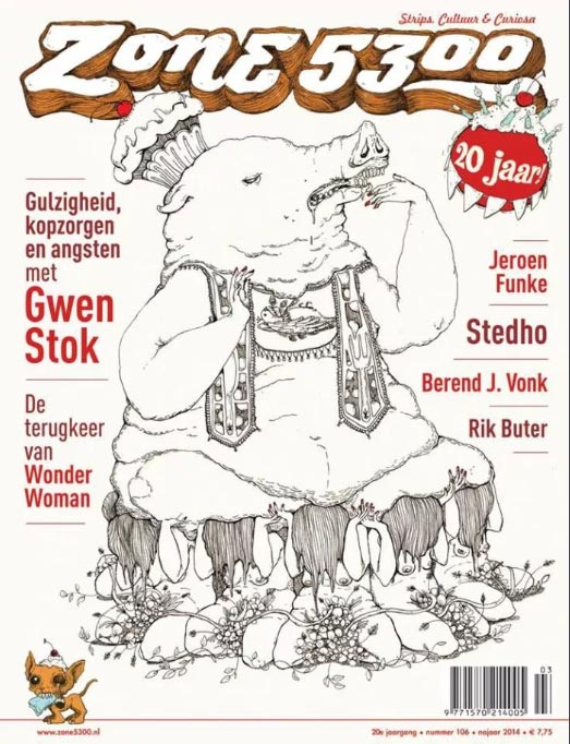 Gwen Stok was born in 1983 in Rotterdam, where she studied at the Willem de Kooning Art Academy from 2000 to 2005. After she received her Bachelor of Fine Arts, she became an independent artist on both commercial and personal art projects. Stok makes editorial illustrations in several techniques and styles, and has provided cultural periodicals like Schokkend Nieuws and Oh Marie! with cover illustrations. Her comic stories have appeared in magazines like Zone 5300 and Kutlul.