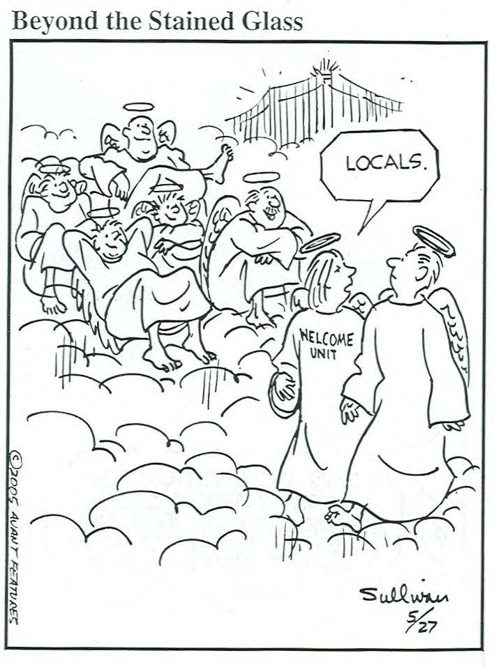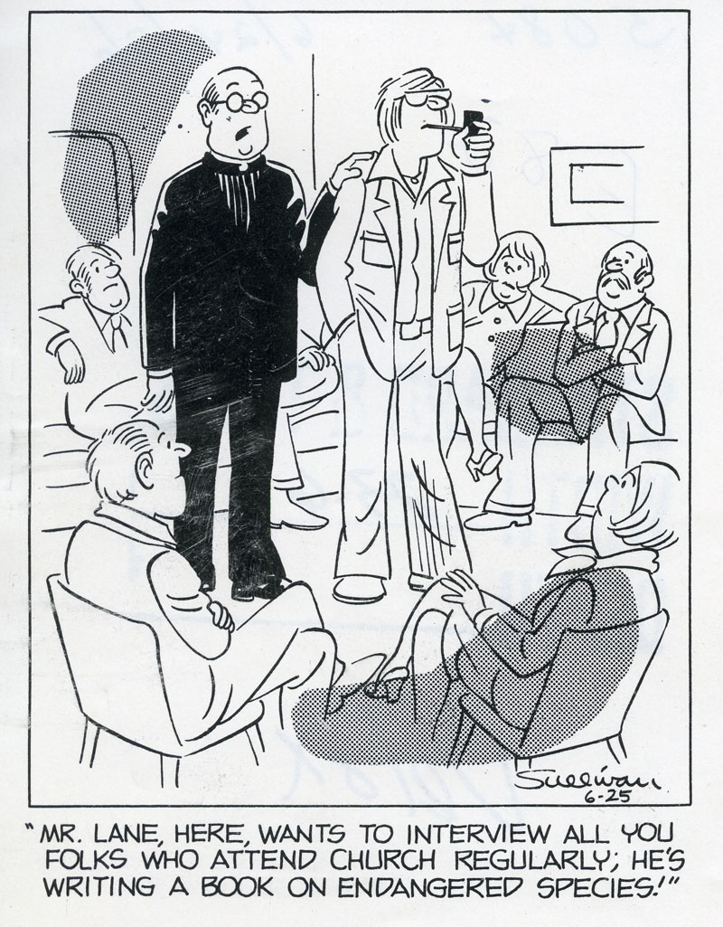 In 1967, he started his own Avant Features syndicate to distribute his 'Beyond the Stained Glass' cartoon feature to both religious and non-religious publications. Over the years, Sullivan's cartoons became more secular in nature, and often satirized the Church in the post-Vatican II era. Argus Communications in Chicago published another collection of his illustrations under the title 'Laughter through an open window: A Modern Pilgrim's Progress' (1968). From 1971 through the 1980s, Sullivan's cartoons ran in The Catholic Standard and Times.