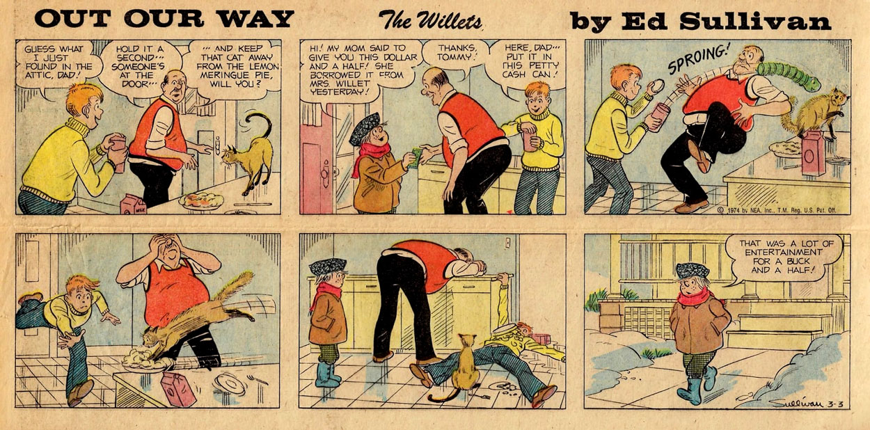 During the 1970s, Sullivan also joined the Newspaper Enterprise Association (NEA) as a comic creator. In 1971, he succeeded Paul Gringle on the Sunday comic 'Out Our Way with the Willets', and continued it until the end of its run in 1978. The feature was the Sunday companion to the daily cartoon panel 'Out Our Way', created in 1922 by J.R. Williams, and then continued until 1975 by his assistant Neg Cochran. While the daily panel depicted American rural life with a variety of recurring characters, the Sunday comic focused on the small-town Willets family. During Sullivan's tenure, it ran in about 150 newspapers.