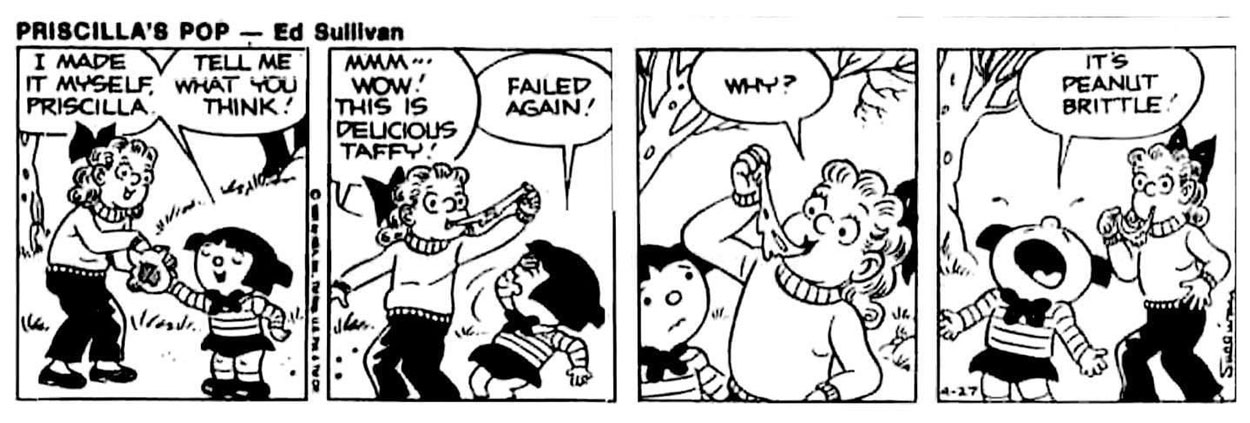 While still working on the 'Out Our Way' Sunday feature, Sullivan took over the NEA's daily 'Priscilla's Pop' strip from its creator Al Vermeer on 19 July 1976. In 1977, he also took over the Sunday page. Created by Vermeer in 1946, the feature was a sitcom-style family comic, dealing with the everyday life of the Nutchell family, consisting of father Waldo, mother Hazel, school-age daughter Priscilla, sports-minded son Carlyle and the family dog, Oliver. Al Vermeer continued the comic until the end of its run on 11 September 1983.