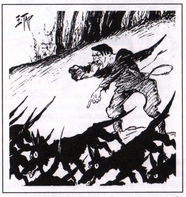 "La meute est sortie" ("The pack is out", 1940). Cartoon by E. Tap depicting Adolf Hitler at the start of World War II.