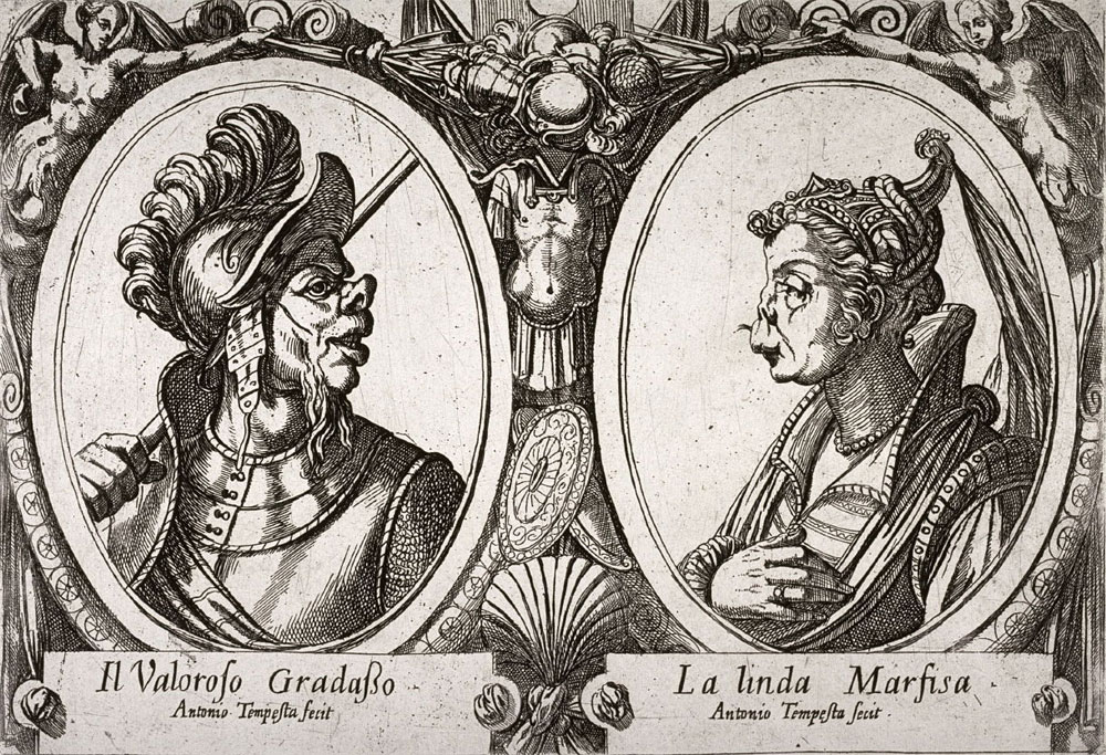 Tempesta continued the Italian tradition for caricaturing, introduced by Leonardo da Vinci, by illustrating Ludovico Ariosto's classic novel 'Orlando Furioso' around 1600. In the introduction he portrays the main characters Ruggiero, Bradamante, Rodomonte, Isabella, Gradasso, Marfisa, Angelica and Medoro in two-sequential panels which portray each couple looking at one another. Their features are grotesquely but hilariously exaggerated, proving that he had a talent for cartoony drawing which he unfortunately never explored again in his career.