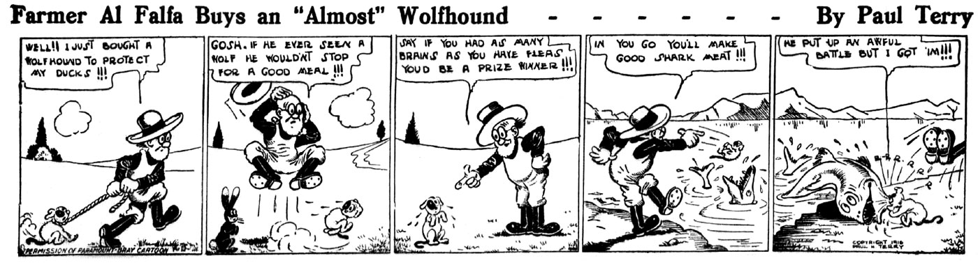 After seeing Winsor McCay's groundbreaking animated short 'Gertie the Dinosaur' (1913), Terry decided to become an animator. He sold his first film, 'Little Herman', to the Thanhouser film company in 1915. His first successful cartoon character was the grouchy farmer Alfalfa (sometimes spelled as "Al Falfa"), who debuted in 'Down on the Phoney Farm' (1915). Between 1916 and 1917, Terry was an animator for the J.R. Bray Studios, where Farmer Alfalfa was one of their main series. To advertise their animated productions, the Bray Studios also produced a series of newspaper comic strips. Running for only a few months (September-October 1916), the series included strips with the Earl Hurd creation 'Bobby Bumps', Bray's own 'Colonel Heeza Liar' and 'Farmer Al Falfa' by Paul Terry.