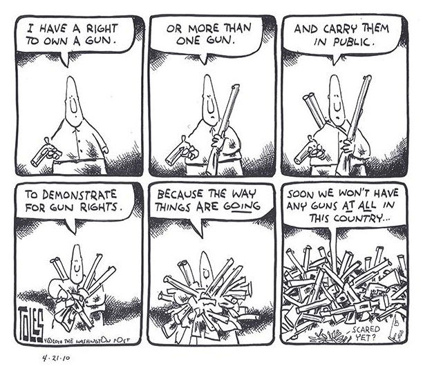 Cartoon by Tom Toles about gun ownership, The Washington Post, 21 April 2010.