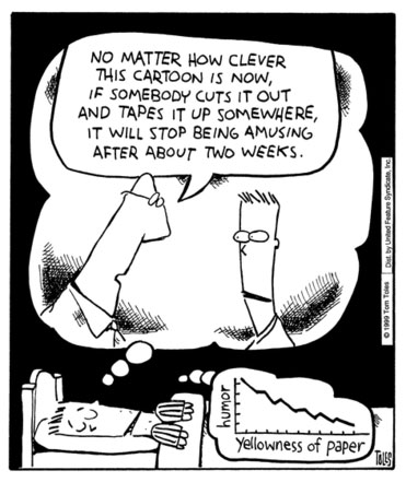 Between 3 January 2000 and 13 July 2003, Toles created the Sunday gag cartoon panel 'Randolph Itch 2 A.M'. for the Buffalo Evening News. Each episode features a youngster, Randolph, lying awake at night or having nightmares about future events. His worries range from unprepared exams, embarrassing dates or forgetting to bring something important the next day. The series was autobiographical. Tomes frequently suffered from depressions and insomnia. At age 21, it was so problematic that he often crossed off days on his calendar because it would be "one less day he had to go through." Unfortunately, Toles had to drop 'Randolph Itch 2 A.M.', when he left the Buffalo Evening News to join the Washington Post.