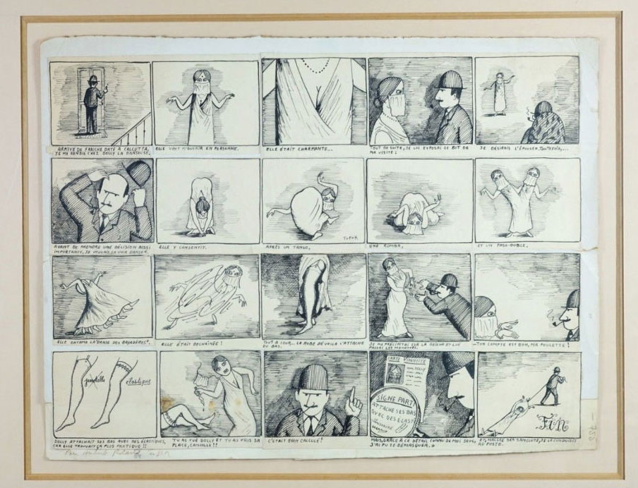 In 1961, Topor achieved his breakthrough in the satirical and controversial magazine Hara-Kiri, edited by François Cavanna. Hara-Kiri had a mission to be as outrageous and taboo-breaking as possible. Throughout its decade-long run, it was banned three times. Topor was one of Hara-Kiri's earliest regular contributors, appearing alongside other core contributors like Jean-Marc Reiser, Fred, Wolinski, Cabu and Gébé. However, he was still the odd one out. He didn't draw traditional humorous cartoons or comics and avoided text as much as possible. Some of his drawings made use of sequences, like 'La Danseuse de Calcutta' ('The Danser of Calcutta', issue #27, April 1963), a strange text comic in which a man visits a dancer and afterwards drags her along with him on a rope. Another sequential story was 'Cérémonies Pour Le Corps Neuf' ("Ceremonies For The New Body") in issue #31 of September 1963. In five drawings, Topor depicted a young woman becoming an adult, receiving her first stockings, jewels, bra, lipstick and high heels. Other sequential illustrations by Topor for Hara-Kiri were one titleless story (1961), 'L' Homme et la Mouche' (1962) and 'Le Fils de l' Ivrogne' (1964).