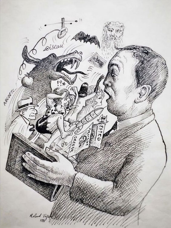 Topor was a frequent guest in the radio game show 'Des Papous Dans la Tête' (1984-2018) at France Culture. The program, broadcast in front of a live audience, featured many humorous items, scripted by the participating guests. Many novelists, poets, journalists, essayists, playwrights, film directors, actors, comedians and cartoonists have made contributions over the years.