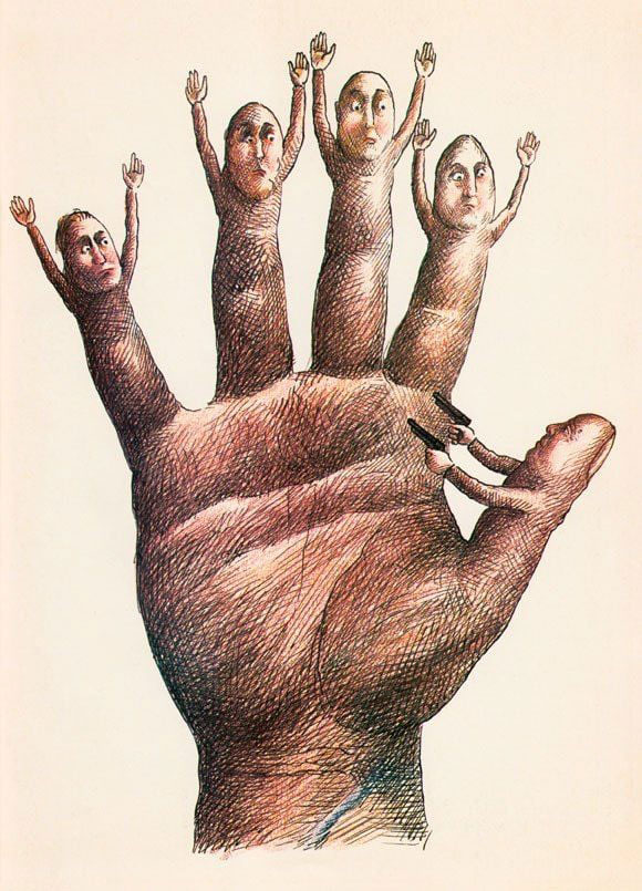 Famous cartoon by Topor, first used for the cover of Mépris nr. 1 (1973), later reused for Amnesty International posters, 1977.