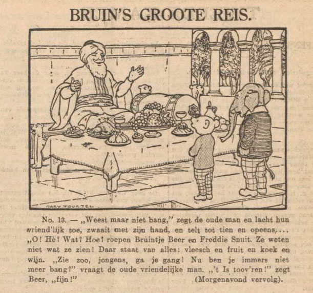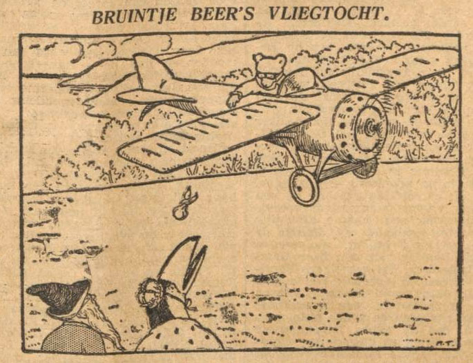 From the 1920s on, 'Rupert' was published all over the British Empire and their dominions. The bear also ran in other languages: Dutch ('Bruintje Beer'), French ('Rupert l'Ours'), Portuguese ('Rupert, o Urso'), Norwegian ('Rupert Bjørn'), Swedish ('Olle Brum', where it originally ran in Dagens Nyheter) and Finnish ('Roope-karhu'). Especially in the Netherlands, it was extraordinarily popular. On 5 November 1929, the series first appeared in the newspaper Algemeen Handelsblad. Since 'Rupert' was originally published in black-and-white, Dutch translators simply named him 'Bruintje Beer' (literally: "Little Brown Bear"). Naturally this caused a glaring error once Rupert was published in color. Yet few readers ever noticed or complained that Bruintje's name didn't match with his white fur color. Therefore his name was never changed, even when other papers ran his adventures. When 'Rupert' was removed from Het Nieuwsblad van het Noorden in 1934, Marten and Jan Gerhard Toonder created a replacement comic about the white polar bear 'Thijs IJs' (1934-1938). Another example of Rupert's lasting popularity with Dutch readers was Phiny Dick and Ton Beek's own text comic about a smart bear, 'Birre Beer' (1954-1959), introduced in Algemeen Handelsblad as "the son of Rupert". Between 1987 and 1990, old 'Rupert' stories by Alfred Bestall ran in the Dutch Disney weekly Donald Duck, adapted by chief editor Thom Roep into the balloon comics format.