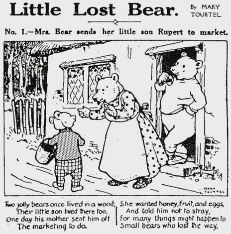 Ever since Clifford Berryman made his iconic "teddy bear" cartoon in 1902, cute bear dolls had been popular among children. This also translated into comics, with Julius Stafford Baker's 'Tiger Tim' (1904) and Kitsie Bridges and Dora McLaren's ' 'Bobby Bear' (1919) as direct predecessors of Rupert. An unconfirmed rumor claims the character was a suggestion from the grandmother of Peter Bessel, a member of the British Parliament, who came up for the Labour Party. Bessel's grandma had sent her idea to the newspaper and, according to legend, received £50 for the rights. What is certain is that right from the start, Herbert Tourtel wrote the texts, while Mary Tourtel provided the artwork. On 8 November 1920, the first episode of The Daily Express' new comic strip appeared in print. The original title was 'Little Lost Bear'. Only later did Rupert receive a name. Like most European comics at the time, it followed a text comics format, with text written underneath the images.