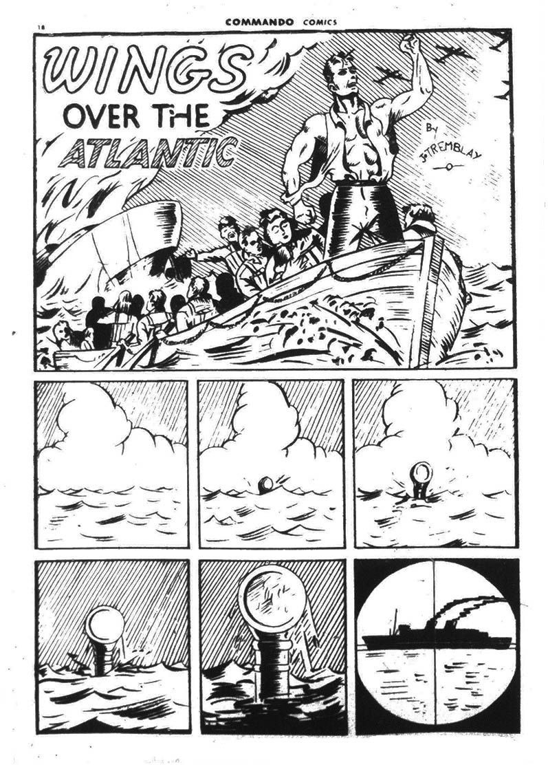 One of Bell's leading titles was Wow Comics (1941-1946). In the second issue of November 1941 the editors announced a drawing contest. Jack Tremblay participated and his talent was duly noted. By the May/June 1942 issue (#8) Tremblay was part of the team with his own feature about ace fighter pilot 'Crash Carson' and his squadron, the Devil's Angels. He had only just turned sixteen, and was a first-year student at the École des Beaux Arts in Montreal. 'Crash Carson' remained in active duty until Wow Comics issue #16 (August/September 1943), and Tremblay additionally made a feature called 'Wings over the Atlantic' for the first three issues of Bell's Commando Comics (1942-1943). It was then continued by Andre Kulbach (brother of René Kulbach).
