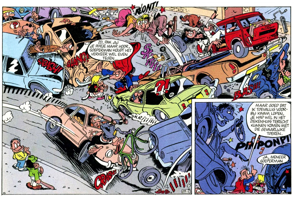 The hilarious 'Soeperman' stories with their slapstick humor and abundance of visual jokes, instantly captivated readers. Initially appearing in stories from two or three pages, Ritstier and Uilenbroek later turned to longer stories of eight pages, as well as the full-length episode 'De Bollen van Rokan'. A disagreement with editor Dirk Snoodijk of SjoSji magazine ended the first run of the 'Soeperman' comic. While the authors preferred to create longer stories, the editor requested short ones. An important factor was Uilenbroek's slow working rhythm, which often put an serialization of ongoing episodes in danger.