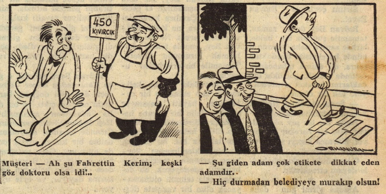 Besides Son Posta, Orhan Ural was also a regular contributor to the satirical magazine Akbaba for many years. He later switched to Sedat Simavi's humor magazine Karagöz, while also making folk paintings for the newspapers Köroğlu and Hemşehri. His cartoons also appeared in papers and magazines such as Nasrettin Hoca, Vakit, Haber, En Son Dakika, Tercüman, and Tasvir, and also in French and American newspapers. During the later years of his career, Ural worked for the newspaper Yeni Sabah. In 1950 he made a comic strip for the paper based on 13th-century wiseman Nasreddin Hodja, called 'Nasreddin Hoca'nın Resimli Fıkraları' ("The Illustrated Stories of Nasreddin Hodja"). In that same year he filled the section 'Haftanın Aynası' ("The Mirror of the Week") with his caricatures. Among his other serials for Yeni Sabah were 'Avukat' (1952) and 'Mişon'un Fıkraları' ("The Adventures of Mişon", 1953).