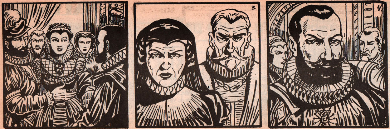 Between 5 September and 28 November 1972, Valentin drew the text comic serial 'La Reine Margot' for the French regional newspaper L'Écho du Centre. In 100 episodes, it told the story of Marguerite of Valois (1553-1615), who became Queen of Navarre by her marriage to Henry III of Navarre and then also Queen of France at her husband's 1589 accession to the throne as Henry IV. The comic is based on Alexandre Dumas' classic novel 'La Reine Margot' (1845), about this female monarch.