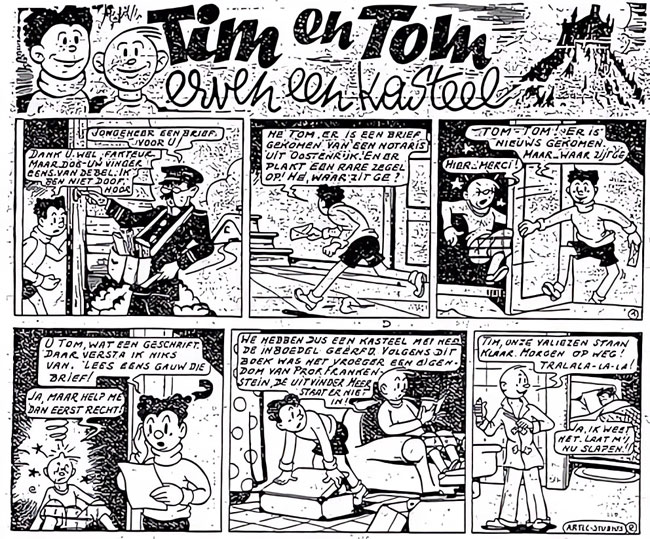 Around 1947-1948, Van Meulenbroeck joined the De Moor's Artec-Studio's, run by Bob De Moor and his brother-in-law John van Looveren to produce comic strips for Flemish magazines and newspapers. Van Meulenbroeck was mainly involved in finishing De Moor's sketches, but also drew a couple of gag strips by himself, signing with "AVM". Mon Van Meulenbroeck is most likely the artist behind the adventure series 'Tim en Tom' (1949-1951), which ran in both Kleine Zondagsvriend and 't Kapoentje. Two stories are known, namely 'Tim en Tom Erven Een Kasteel' and 'Tim en Tom Contra Mr. X'. Between 1958 and 1960, they were also serialized in the local West Flemish newspaper Het Wekelijks Nieuws. François Cassiers (who later formed the comedy duo The Woodpeckers with his brother Jef) possibly also contributed to these productions.