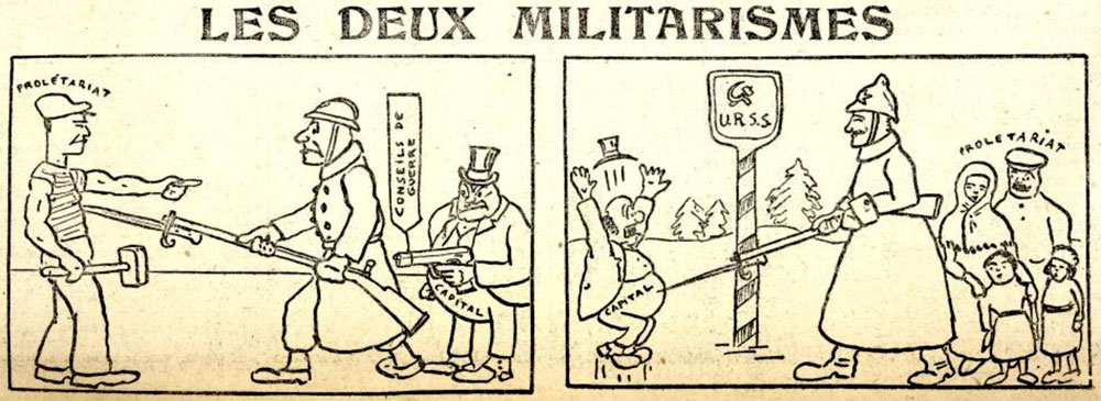 'Les Deux Militarismes', Le Drapeau Rouge, 2 February 1935. The cartoon shows how in Belgium capitalists are in power, oppressing the proletariat, while it's the other way around in the USSR.
