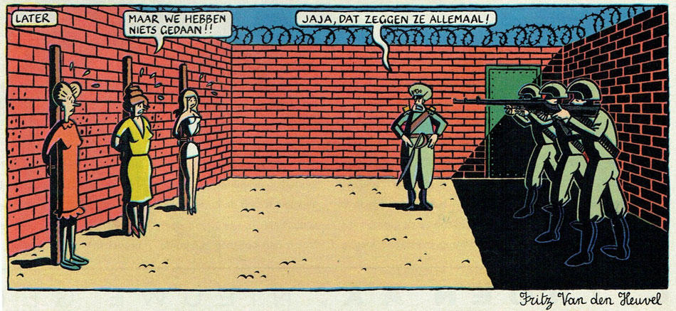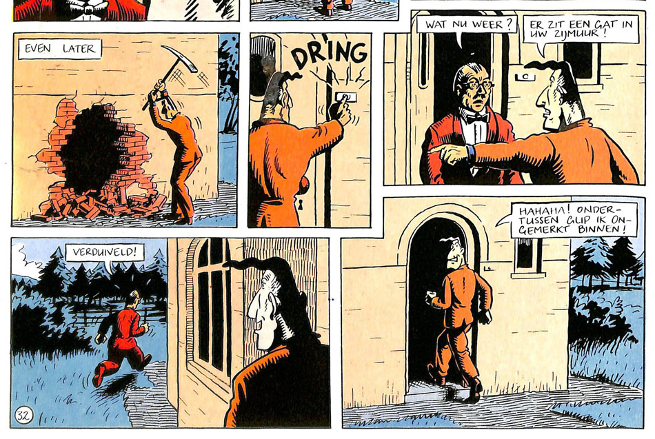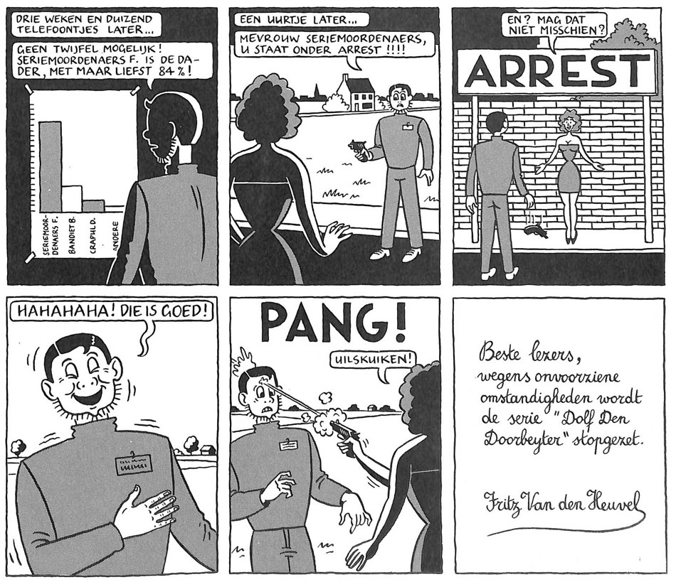 In 1992, in between two longer adventure stories, Vermassen created several one-to-two page gag comics for Humo, co-scripted by the previously mentioned and pseudonymous Sputnik. Since they were easier to make, they offered a welcome intermission while preparing longer adventures again, simultaneously keeping his cult followers tied in. The short gags are pastiches of typical classic adventure comics, featuring ludicrous one-shot characters, like 'Drolkopje' ("Little Turdhead") or 'Flup, De Eeuwige Te Laat Komer' ("Flup, The Eternal Latecomer"). In 'Dolf Den Doorbeyter', Dolf notices many newspaper comic series are abruptly discontinued and deducts it's the work of a "serial killer". He eventually tracks down the culprit, but is then murdered himself, ending his series just as sudden. These gags were collected in the album 'De Kriminele Coverdief' (De Schaar, 1992). In addition, the cartoonist Kamagurka also scripted a few short gags for Van den Heuvel, which were printed in the comic book 'Lava TV Presenteert' (1990), based on Kamagurka and Herr Seele's sketch TV show 'Lava'.