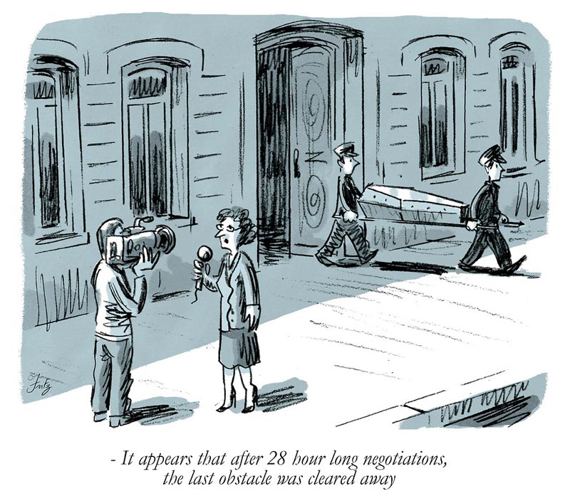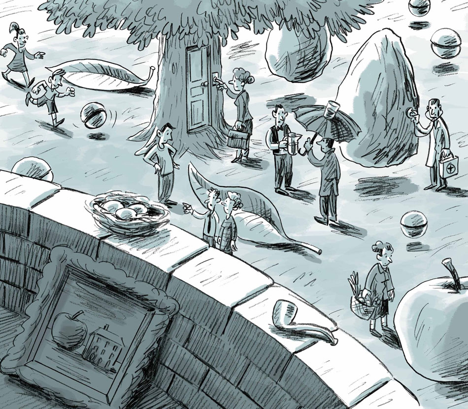 From 2013 until the end of the decade, Joris Vermassen's editorial cartoons ran in DS Avond, the evening edition of the newspaper De Standaard, under the pseudonym "Dr. Fritz". Using a one-panel format, they commented on current events or visualized more straightforward absurd situations. Interviewed by Sam De Wilde (Stripgids, 7 July 2025), Vermassen credited his editorial cartoons with forcing him to work faster, more efficiently and create more striking imagery, which proved beneficial for his later work. One compilation book was released: 'Saaie Boel Hier' (Vrijdag, 2015). Although his cartoons offered him financial stability, Vermassen eventually ended them, because the daily deadlines made it impossible for him to focus on other projects.