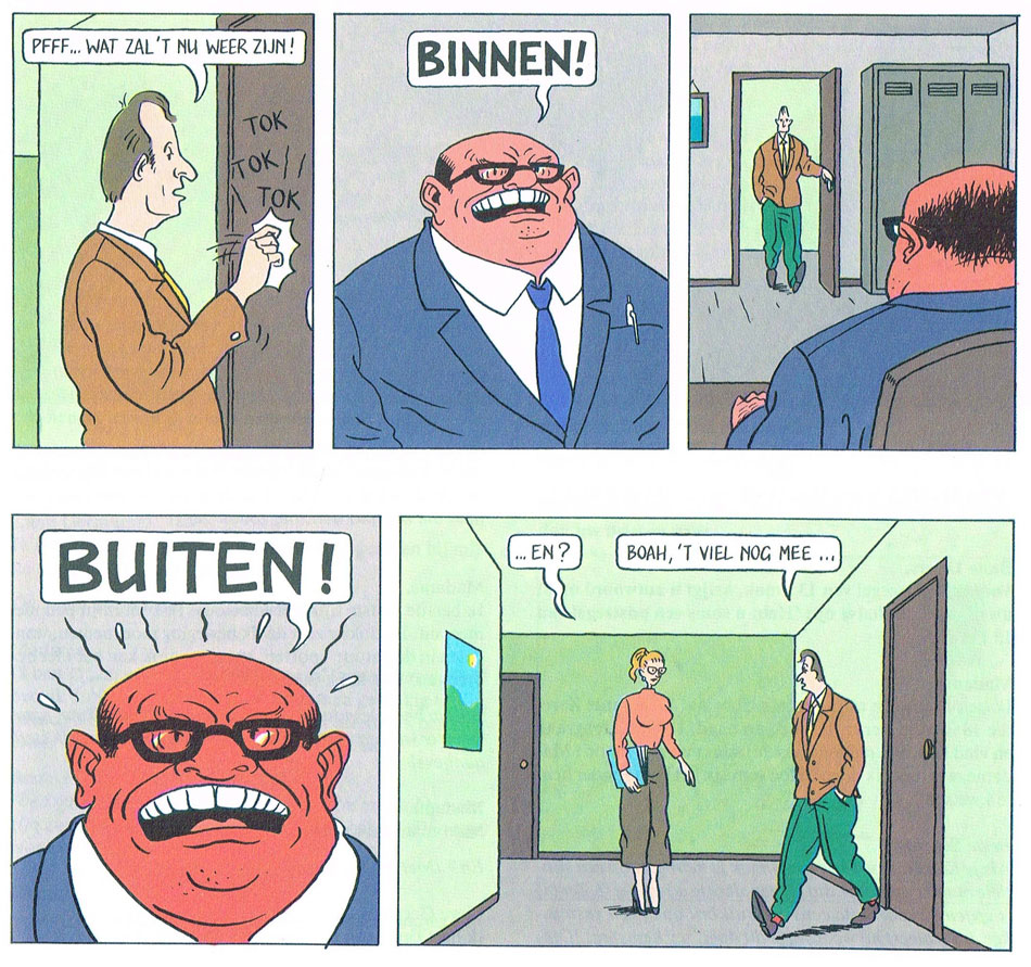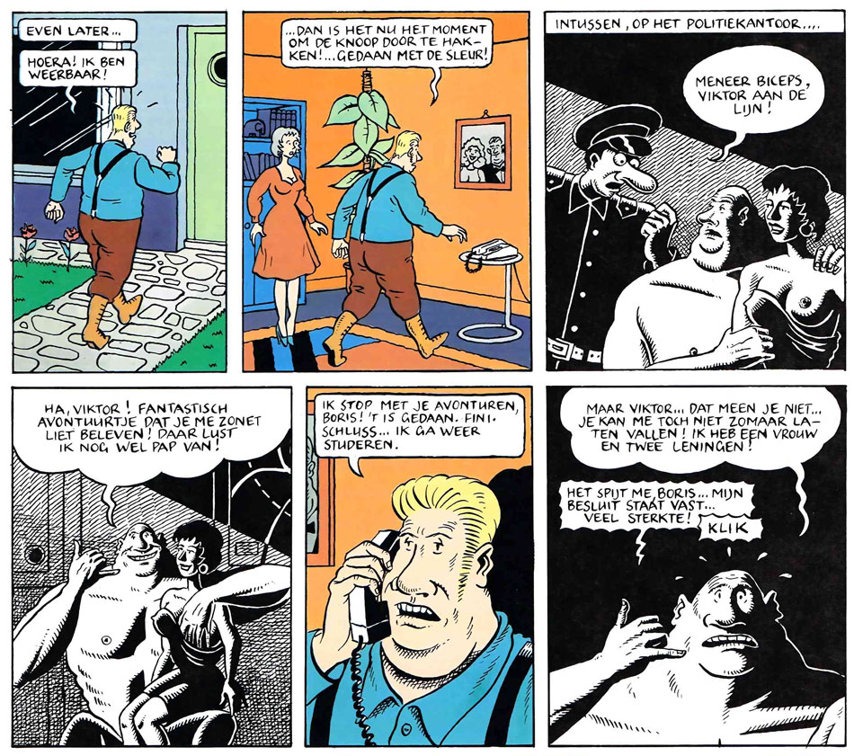 Between 1989 and 1994, the publishers Dedalus and De Schaar collected the 'Bob De Kerpel' stories in four books. However, Vermassen wanted to avoid creating a series built around just one character, since these often turn into hollow factory products. As such, he drew one full-length story without De Kerpel, 'Het Laatste Einde' (1993, with assistance by an artist going by the name of Matto D. Sputnik). Fuelled by his doubts about a future as a comic creator, 'Het Laatste Einde' ("The Final End") happens to be Vermassen's most metafictional and personal comic strip. The plot centers on the troubled relationship between fictional comic creator Viktor Plank and his superhero character Boris Biceps (presented as a comic-within-a-comic). Plank always wanted to be a gynaecologist, but his father felt this was a "cunt profession" and forced him to become a cartoonist instead. The disgruntled comic artist not only hates his job, but is also jealous of Boris, who receives all the glory and success. It motivates him to quit the series, but he's dragged back into it due to audience and publisher's demands.