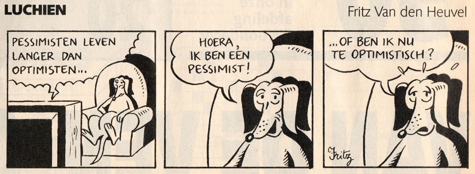 Luchien (Gisteren Zondag #4, 24 October 1993). Translation: "Pessimists live longer than optimists..." - "Hooray, I'm a pessimist! Or am I being too optimistic now?".