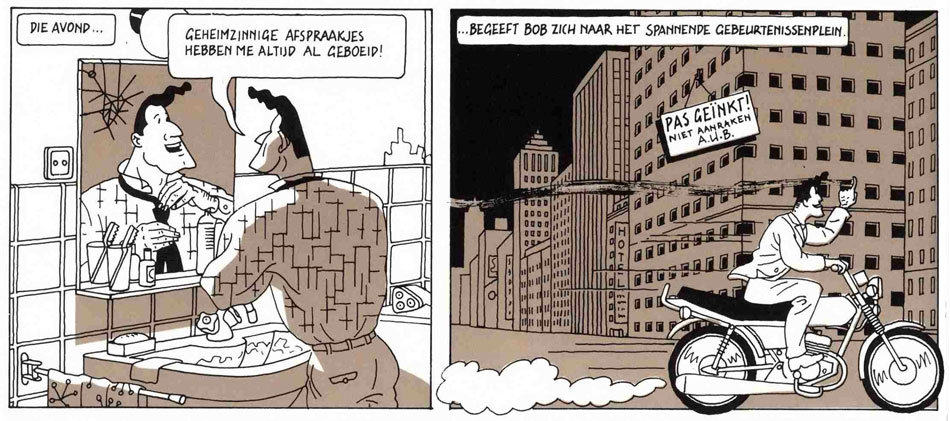 In Humo, Vermassen started using the pseudonym Fritz Van den Heuvel, inspired by the name of Belgian artist and comic pioneer Frits Van den Berghe, in whose former house he lived at the time ("Heuvel" means hill in Dutch and "Berg" is mountain). His most recognizable character became the recurring anti-hero Bob De Kerpel, a big-chinned simpleton with a large black quiff. Since Humo also ran Kamagurka and Herr Seele's 'Cowboy Henk', some readers felt Bob and Henk had a very comparable design. However, interviewed by Toon Dohmen for ZozoLala magazine in 1993, Vermassen said that Seele originally didn't draw Henk with a big chin and only remodelled him after the 'Bob De Kerpel' stories started appearing. Presented as a "demolisher of TV sets", Bob starred in five stories: 'De Verdwenen Stembanden' (1989), 'Het Valse Kunstgebit' (1990), 'Operatie Vrouwenhart' (1991), 'De Vermaledijde Daders' (1994), 'De Rijzende Ster/'De Extravagante Exploten' (1997, 2001). Technically, Bob is present in only four-and-a-half, since 'De Vermaledijde Daders' starts off with a different protagonist, Lex Lenin, who originated in a previous two-page one-shot comic by Van den Heuvel: 'Lex Lenin Wordt Beroemd'. In 'De Vermaledijde Daders', Lenin investigates the notorious criminal Frans Daders until our hero falls from a cliff halfway through the story and dies. A Union of "Famous Comic Characters" holds a speedy conference to find a suitable replacement, but Lucky Luke and Asterix "are too busy with their own adventures", Superman "has a headache", Mickey Mouse "is too concerned with his branch in Paris", a Smurf needs to visit a speech therapist, while Tintin "only does commercials nowadays". In the end, De Kerpel is brought back to finish the story.