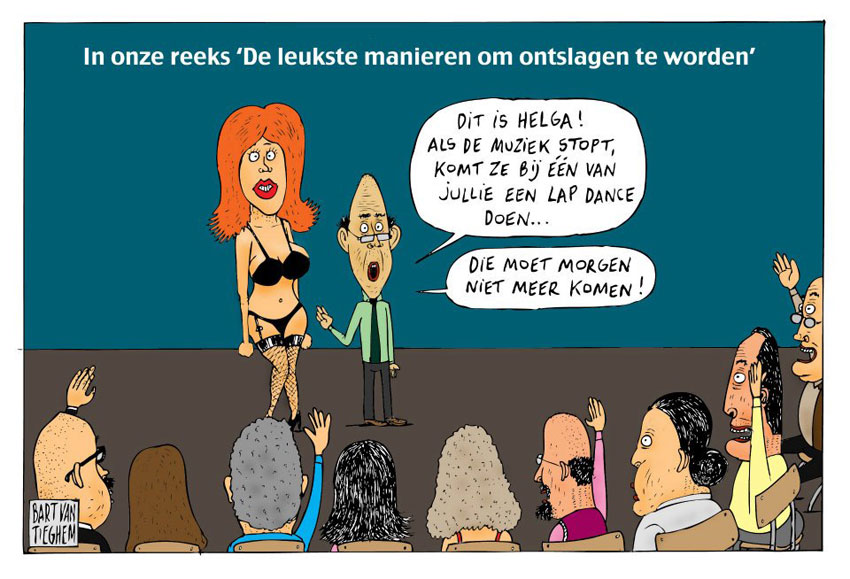 Cartoon from 29 February 2012. Translation: "In our series 'The most fun ways to get fired'. "This is Helga! When the music stops, she'll do a lap dance with one of you, who no longer has to show up for work again tomorrow."