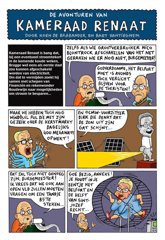 When the socialist Renaat Landuyt was elected as new mayor of Bruges in 2013, De Brabander was inspired to join in again. The comic was retitled to 'De Avonturen van Kameraad Renaat' (2013-2018), depicting Landuyt as a Soviet-style communist. De Brabander and Vantieghem took the opportunity to ask for a full page, allowing for more narrative possibilities. While Vantieghem remained the scriptwriter and had the definitive say over the end project, De Brabander brainstormed with him and made suggestions, sometimes merely to keep the tone a bit more civil.