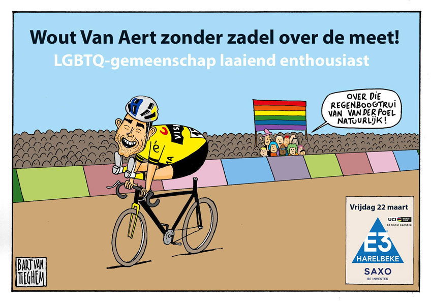 On 21 January 2024, field cyclist Wout Van Aert participated in the World Championship Field Cycling in Benidorm, Spain, when he suddenly fell and broke his saddle. Undaunted, he climbed back on his bike and won the contest. On 23 January, Vantieghem drew a cartoon depicting Van Aert on his saddleless bike, with members of the LGBTQ community being "enthusiastic", but adding the distinction: "about [Mathieu] Van Der Poel's rainbow-colored shirt, of course!". Some readers felt the cartoon was in bad taste towards the LGBTQ community, so the website providers of the E3 Saxo Classic took it offline after one day and issued an official apology. Interviewed on Radio 2, Vantieghem explained that he understood that the organization was a bit startled by the commotion, but said that he didn't receive any negative reactions from LGBTQ people themselves: "It's an old moronic cliché joke about gay people, but in the word balloon you'll notice that they say something completely different. They have no eye for Van Aert's missing saddle, but the rainbow flag on Van der Poel's shirt." Vantieghem's cartoon was defended by comedians Reinart Belpaire and Marlies Verschueren, who are respectively gay and transgender, who felt it was funny.
