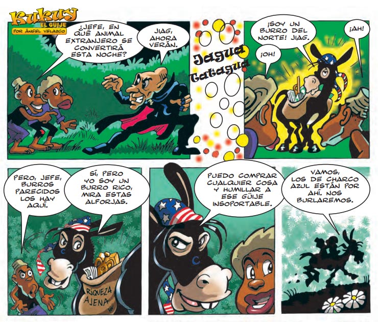 Velazco returned to creating comic strips in 2005, when he began his association with the children's magazine ZunZún of Editorial Abril. He reintroduced 'Kukuy, El Güije de Charco Azul', a goblin-like creature who lives in the "Charco Azul", a magical backwater of the Saramaguacán River. Fueled by the stories he heard from his grandfather while a child, as well as his own research of Cuban mythology, Velazco made his little "güije" a brave and joyful defender of nature. The character Piropo accompanies him on his many battles against El Cagüeiro, a mysterious European villain who can transform in any animal or plant through his evil magic. A true national product, the 'Kukuy' comics deal with the defence of nature and the preservation of the Cuban countryside's cultural traditions.