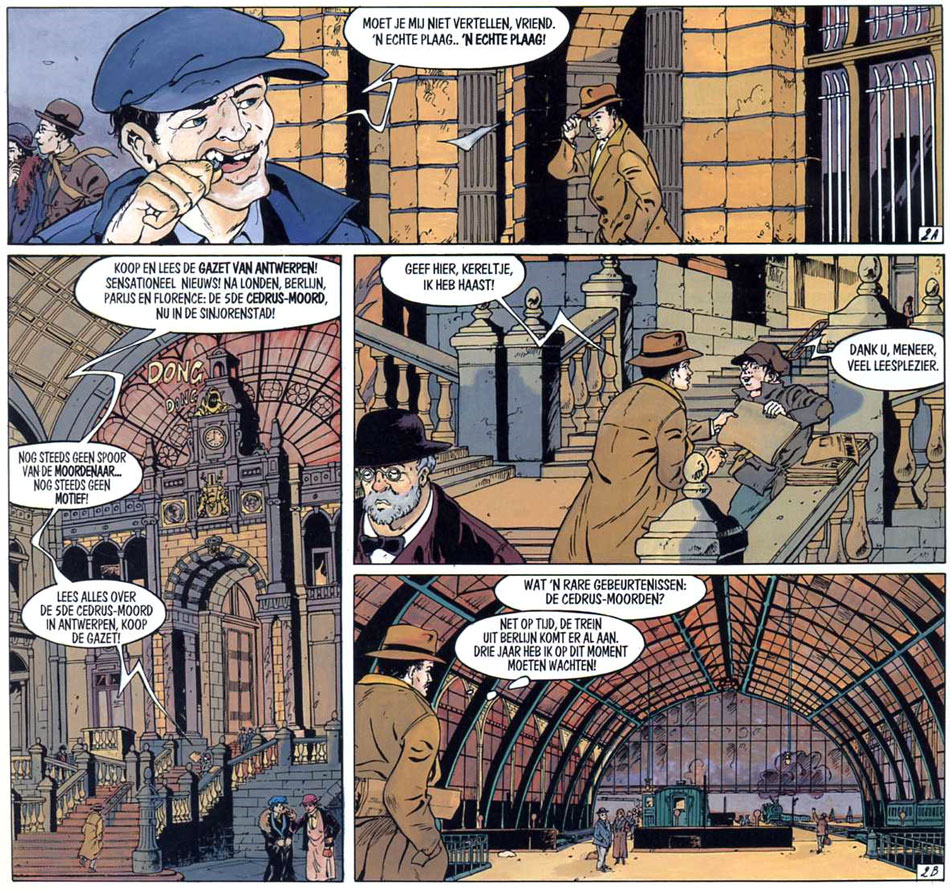 In 1988, Verhaeghe had first met publisher/writer Ronny Matton, but they didn't work together yet. By 1993, Matton had started his publishing imprint Talent. Since the city of Antwerp was that year's Cultural Capital of Europe, Matton and Verhaeghe felt it was the right time to launch their 'Bezette Stad' project. Named after Flemish poet Paul Van Ostaijen (1896-1928)'s poetry collection 'Bezette Stad' ("Occupied City", 1920), their graphic novel series 'Bezette Stad' is set in Antwerp during the First World War, while Van Ostaijen himself is the protagonist. After his exile in Berlin, the writer returns to the "Sinjoren city", where his plans are troubled by a couple of murders. Both volumes of the series, 'Cedrus' and 'Samen Alleen', were released in the same year.