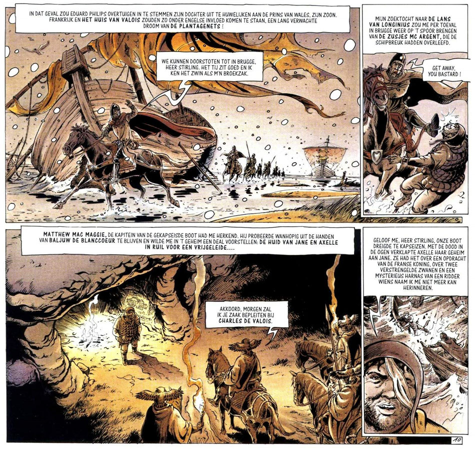 Between 1994 and 1995, Matton and Verhaeghe continued their collaboration with 'Kroniek der Guldensporenslag' (1994-1995), a four-volume historical comic about the 1302 Battle of the Golden Spurs, when Flemish civilians managed to win a battle against French nobility. Three volumes of the series were also released in French under the title 'Ambre Blanc'. In contrast with the more romanticized retellings of the epic confrontation, Verhaeghe and Matton chose for a more gruesome and fantasy-flavored approach. With the release of these first action-filled comic books, Verhaeghe was quickly heralded as the most promising new realistic comic artist in Flanders.