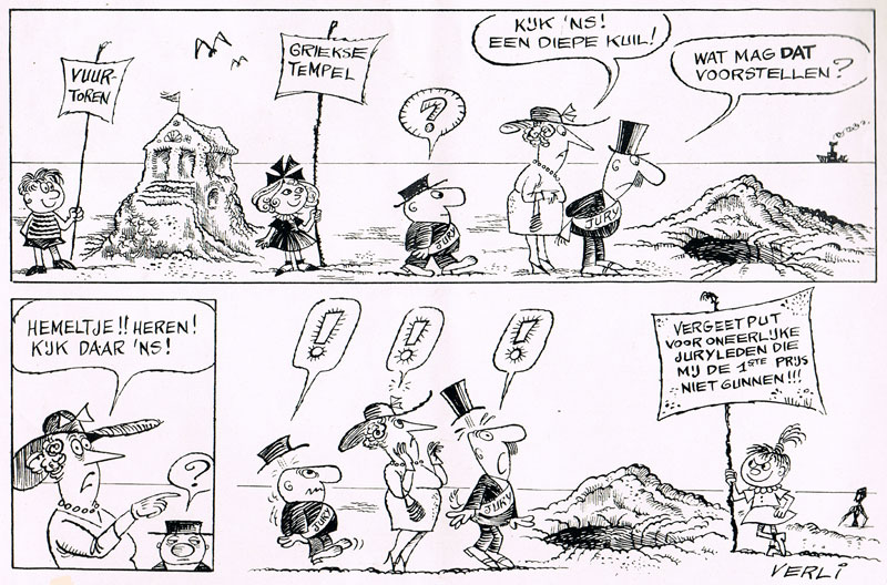 'Emile', about a children's drawing that came to life, is set backstage in comic world, dealing with among others the origins of speech balloons. It is Michel Greg's 'Achille Talon' who leads the young 'Emile' through the comic world. Verli continued to make short stories and illustrations for Pilote until 1973. Verli has also made the satirical comic 'Le Secret Enigmatique du Mystère du Chicon' with Honoré Delbouille (Yvan Delporte), about Flemish-Walloon antagonisms, in the Belgian edition of Tintin in 1972. He was additionally present in the Dutch comic magazine Pep with 'Koning Yaroslav' in 1972.