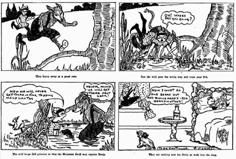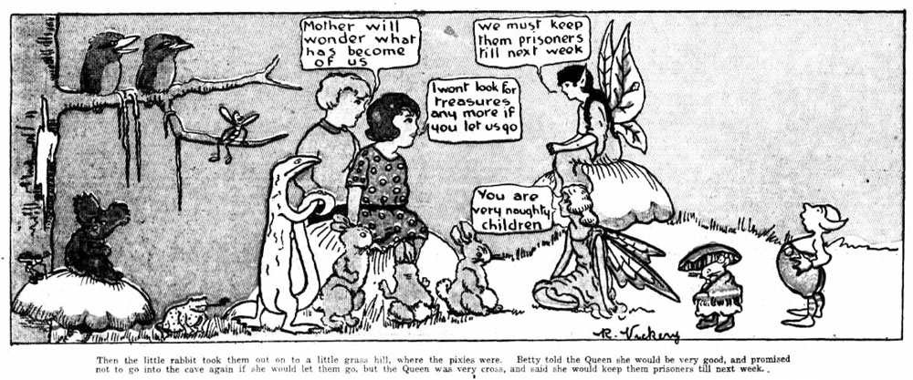 From early 1925 on, Vickery was a regular contributor to the weekly comics supplement of Sydney's The Sunday Times, called The Funny Side. She was one of the few local cartoonists, along with Harry Julius and later Wynne Davies. Vickery's adventures of 'Betty and Bill' started on 22 February 1925. Betty and Bill were "two very naughty children, always wandering away in the bush by themselves", as the caption underneath the first panel reads. And indeed, already in the third panel, the two mischievous kids walk into a fairy's cave. The first serial ran until 3 May 1925, and was followed by a second one between 28 June 1925 and 2 May 1926. Vickery's comic was the only feature that remained when The Funny Side was renamed to Pranks in August 1925.