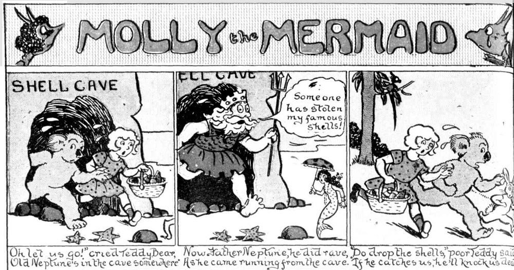 In 1929, Vickery created another magical story, this time starring a mermaid who becomes a girl. 'Molly the Mermaid' appeared from 15 September 1929 until 1 June 1930. Graphically, Vickery's comics were reminiscent of British nursery rhyme picture stories. The colorful panels were filled with kids, talking animals and other fantasy creatures, while the artist used both speech balloons and text captions underneath the image. The speech balloons were dropped in later stories.
