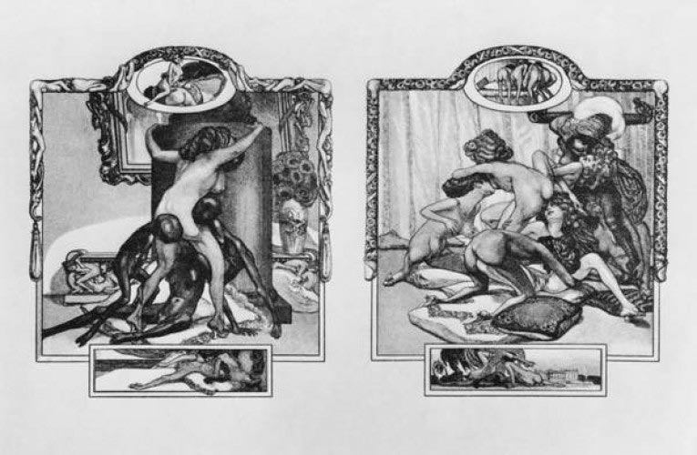 In the late 19th century, certain artists took interest in depicting hedonistic scenes, mostly to shock the conservative, devout and prudent Victorian community. They were quickly nicknamed "the Decadent Movement" and Bayros became one of their members. In 1904, he held his first major exhibition. But Bayros gained his true fame as a book illustrator. He specialized in books with strong erotic content, among them 'Fleurettens Purpurschnecke' (1905), 'The Memoirs of Fanny Hill' (1906), 'Arabian Nights' (1906), 'Pentamerone' (1909) and 'Decamerone' (1911). These works were already audacious enough to shock most people. But Bayros also toyed with taboos in his work, such as lesbianism, zoophilia and nude prepubescent girls. Most critics failed to realize that Bayros merely drew these topics, not actively engaged in them. Even fewer people recognized his sense of design, elegant linework and gracious sensuality. Some drawings have a gentle sense of comedy in them and should not be taken that seriously. But to many he was just a depraved pervert. His 1911 work 'Erzählungen am Toilettentische' caused a huge scandal. Censors banned it and Bayros was forced to leave Munich.